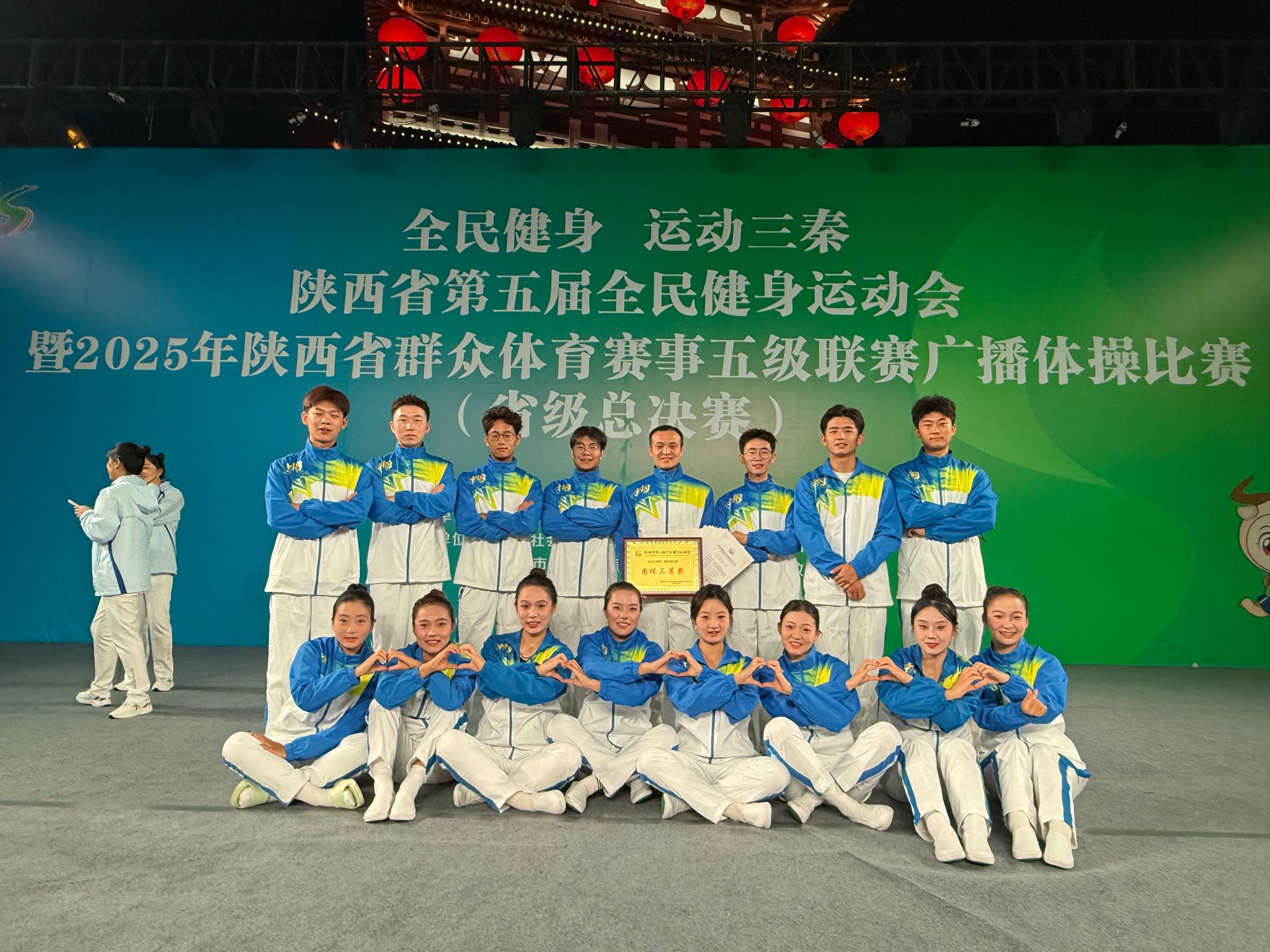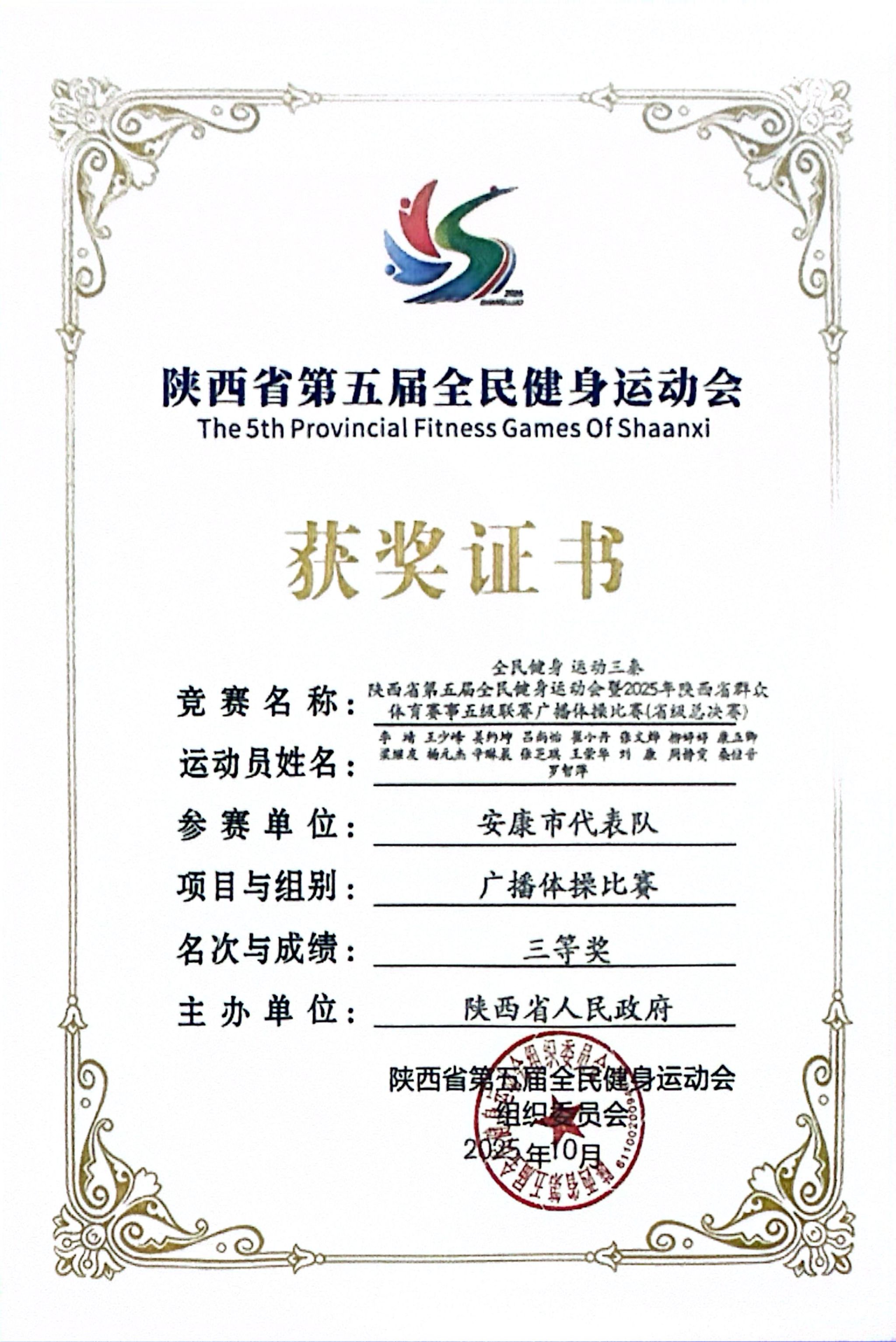 10月13日晚上,由陕西省人民政府主办的陕西省第五届全民健身运动会暨2025年陕西省群众体育赛事五级联赛广播比赛(省级总决赛)在商洛市望江楼广场圆满落幕,公司师生组成的安康市代表队斩获广播体操比赛团体三等奖。