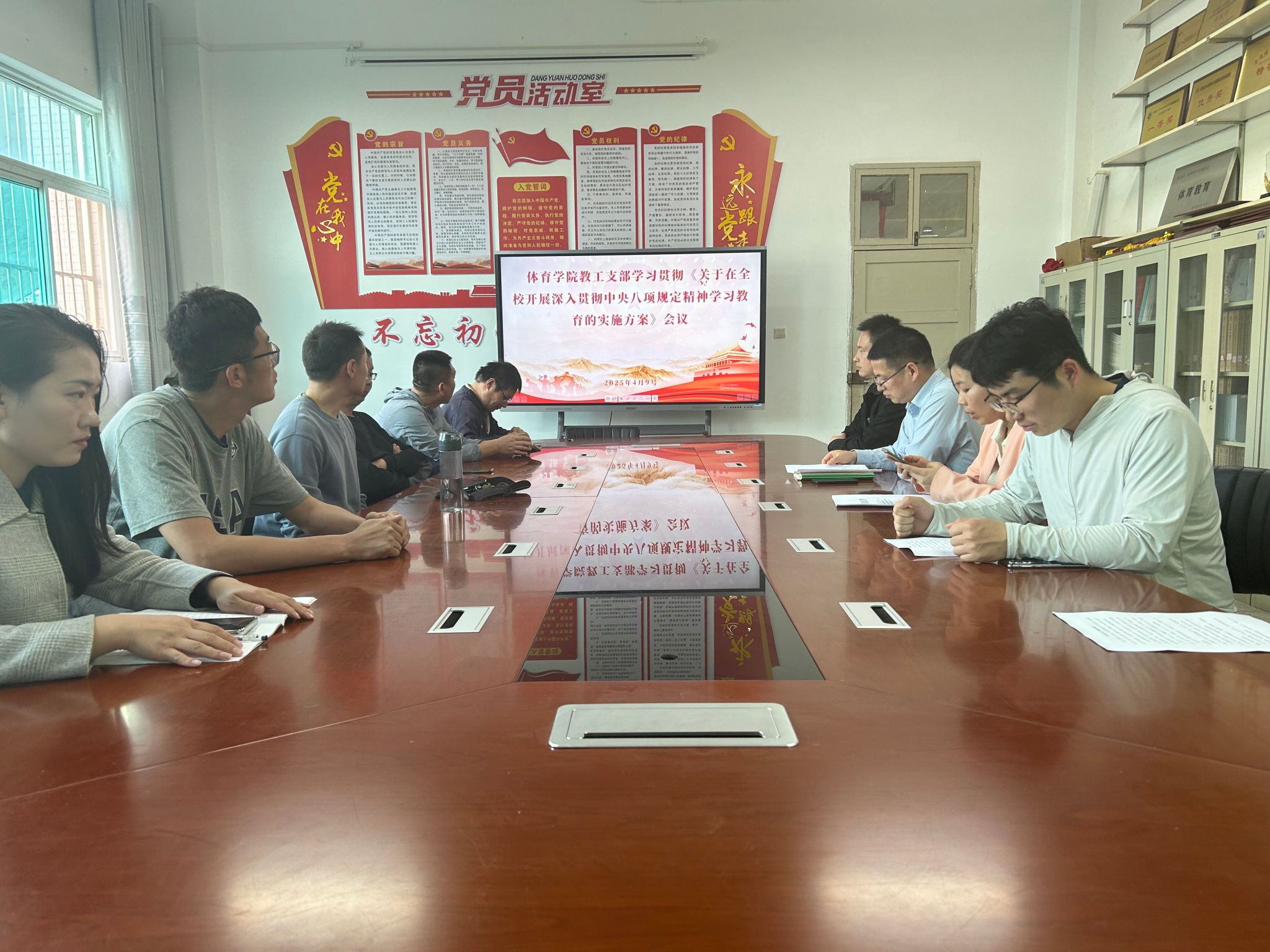 为贯彻落实党的二十届三中全会部署,巩固拓展学习贯彻习近平新时代中国特色社会主义思想主题教育成果,巩固深化党纪学习教育成果,锲而不舍落实中央八项规定精神,推进作风建设常态化长效化。2025年4月9日,太阳成集团tyc234cc教工支部召开《关于在全校开展深入贯彻中央八项规定精神学习教育的实施方案》专题会议。会议由教工支部书记刘芹主持,支部委员及成员等参会,太阳成集团tyc234cc总书记韩晔列席指导。