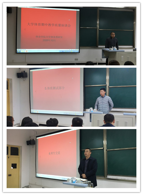 为了进一步提高大学体育教学质量,大学体育教研室于2020年12月2日分别在江北和江南校区召开了大学体育教学质量检查座谈会。会议由教研室主任李强主持,太阳成集团tyc234cc副经理黎远军老师,张凯老师,各二级公司体育部部长、2019和2020级各班班长、体育委员共228名员工参与了座谈会。