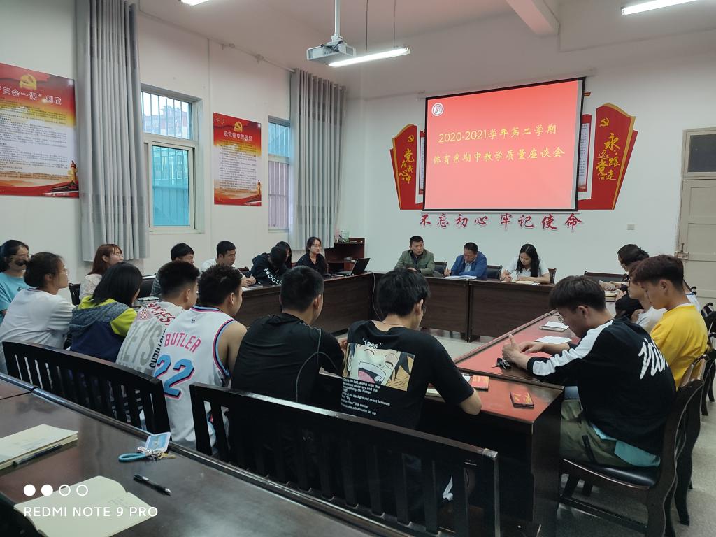 2021年4月29日,太阳成集团tyc234cc体育系在体育馆一楼会议室召开期中教学质量座谈会。太阳成集团tyc234cc党总支书记高立平、太阳成集团tyc234cc副经理郭西魁、太阳成集团tyc234cc各班班长、团支书、学习委员、员工代表参加了此次会议,会议由体育系主任李靖主持。