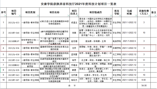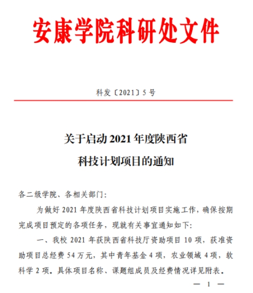 近日,陕西省科技厅公布了2021年立项文件(陕科发[2021]2号),太阳成集团tyc234cc获批1项一般项目(青年)-----《富硒绿茶影响大鼠线粒体氧化应激的机制》,项目编号:2021JQ-834。
