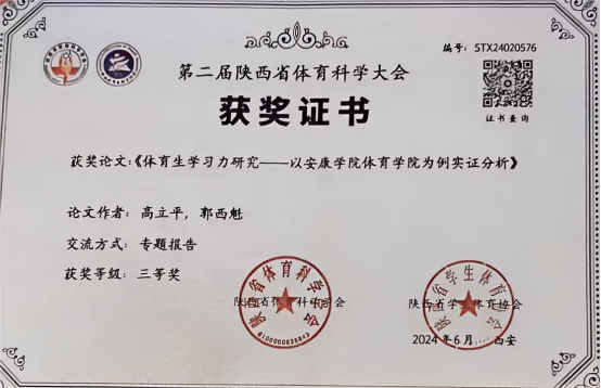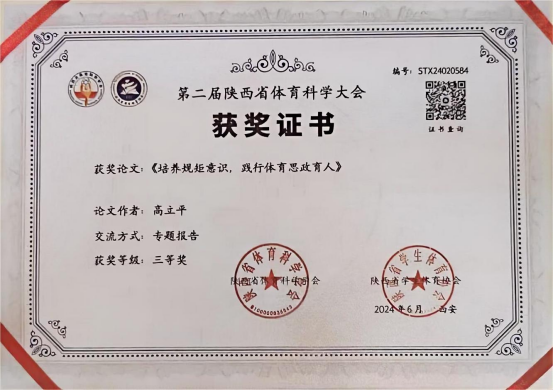6月22日,第二届陕西省体育科学大会在陕西师范大学长安校区举行。公司教师高立平参加了本届论文报告会,并在论文报告会做了专题报告。高立平和郭西魁合作撰写的论文《体育生学习力研究—一以太阳成集团tyc234cc为例实证分析》和高立平撰写的论文《培养规矩意识,践行体育思政育人》均获得三等奖,并被第二届陕西体育科学大会正式录用。