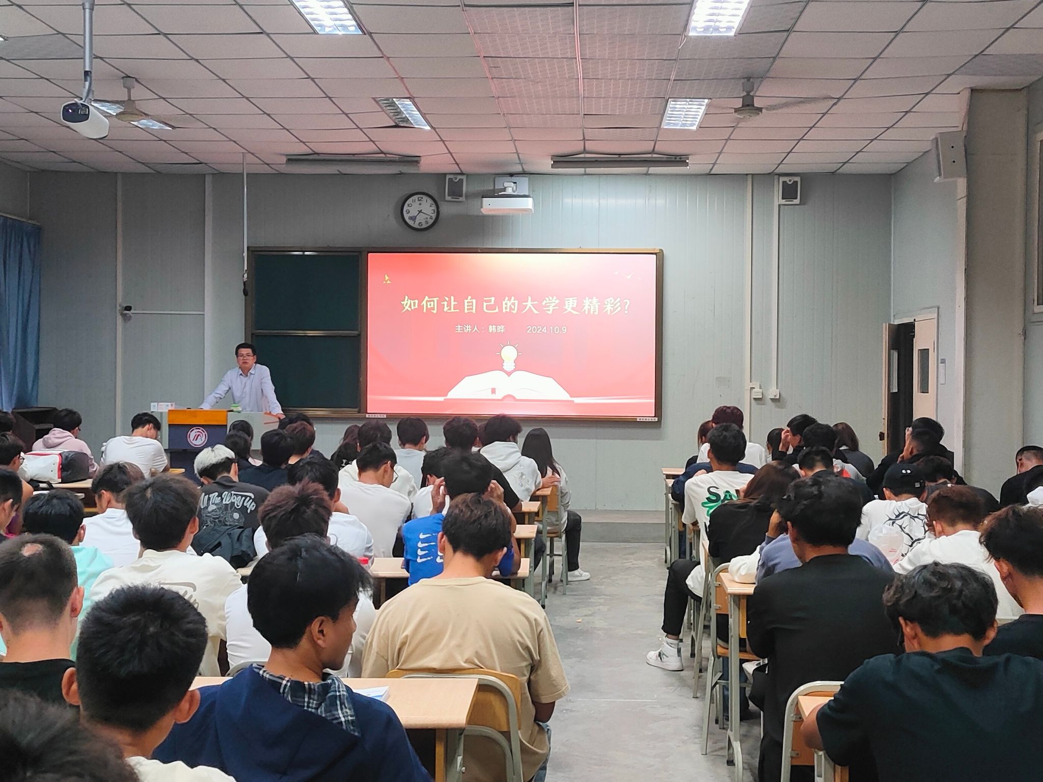2024年10月9日晚上,太阳成集团tyc234cc党总支书记韩晔在10号教学楼1038教室为2024级体院新生带来入学教育课——如何让自己的大学更精彩。韩书记从“认识大学、学会学习、遵守纪律、做好发展”四个方面勾勒出精彩大学四年应有画像雏形,为24级全体新生带来大学启蒙教育,帮助他们正确认识大学,认识自我,了解未来发展趋势,坚定专业自信。