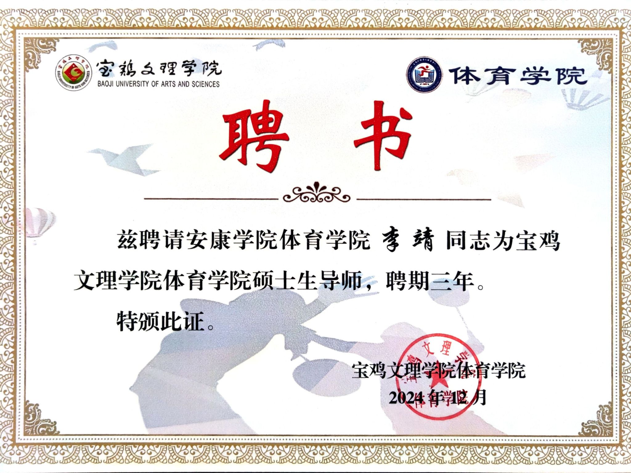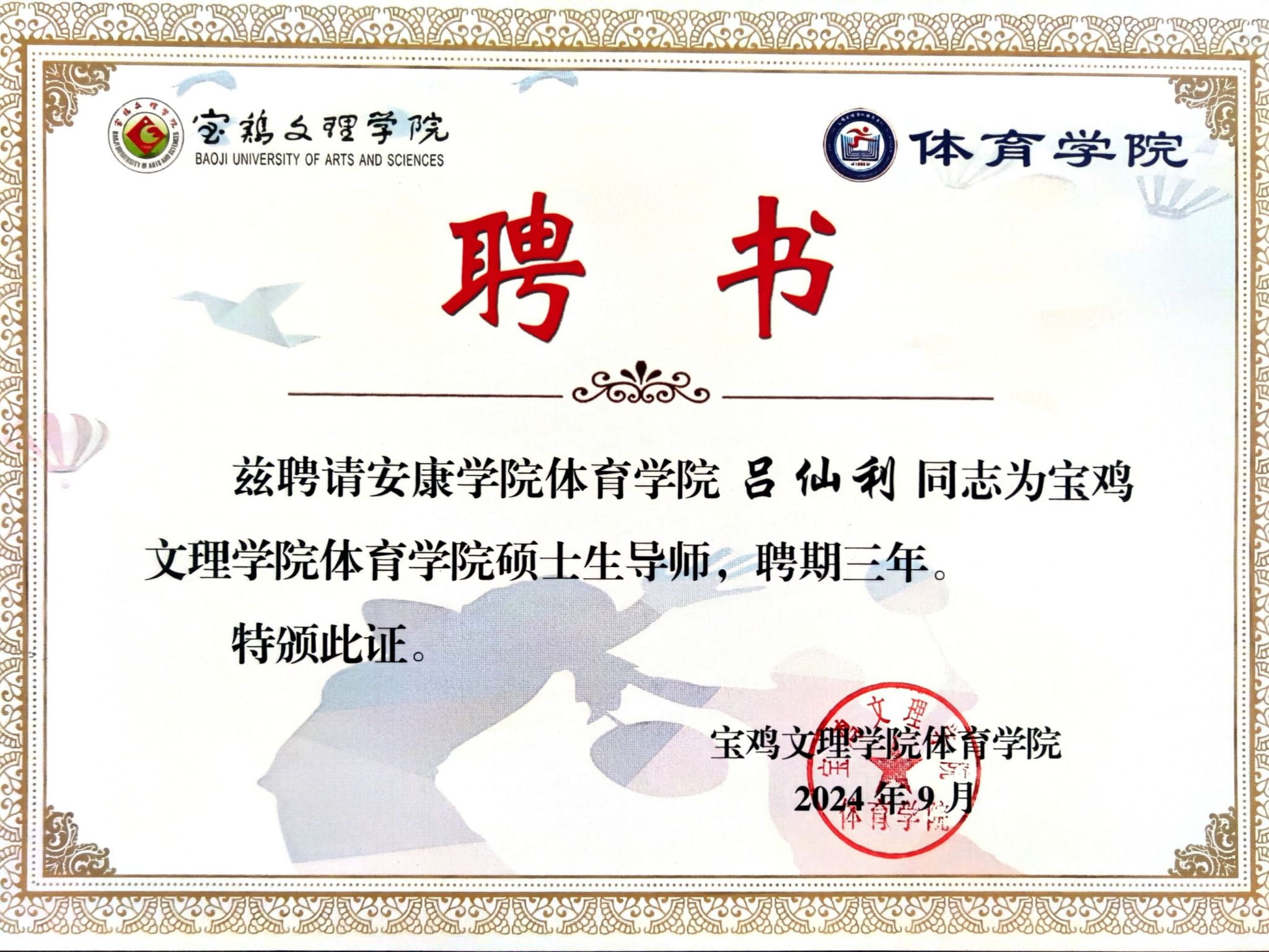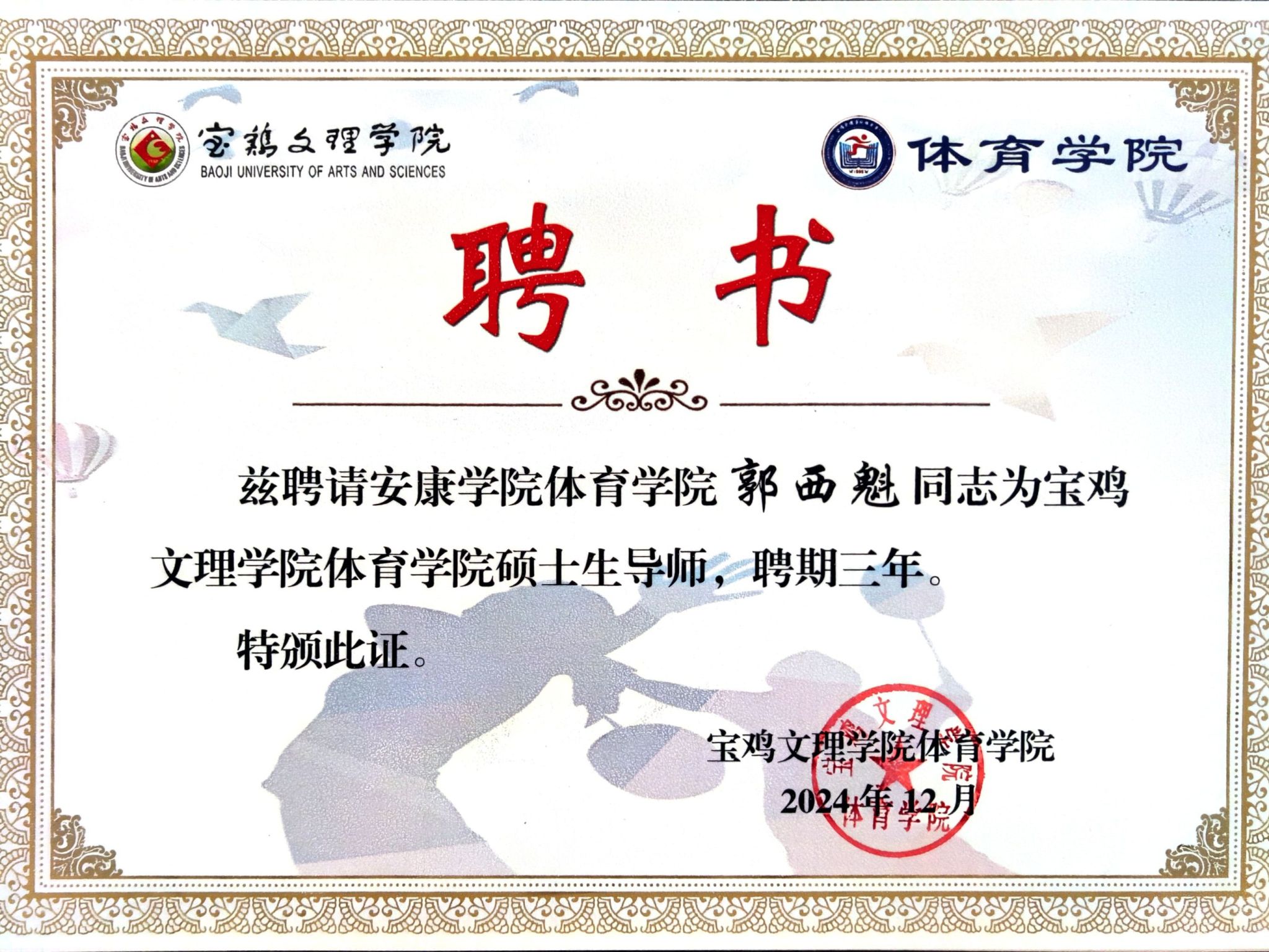 宝鸡文理公司太阳成集团tyc234cc严格按照专业硕士学位教育的要求,经过层层遴选,决定聘任公司吕仙利、郭西魁、李靖三位老师为宝鸡文理公司太阳成集团tyc234cc硕士专业学位研究生指导教师。本次聘任工作不仅是宝鸡文理公司太阳成集团tyc234cc对公司教学团队力量的肯定,同时也将为公司培养一批具有硕士公司产品经验的人才,为进一步促进公司体育教学、科研工作水平的提高和申报专业硕士点奠定了重要基础。