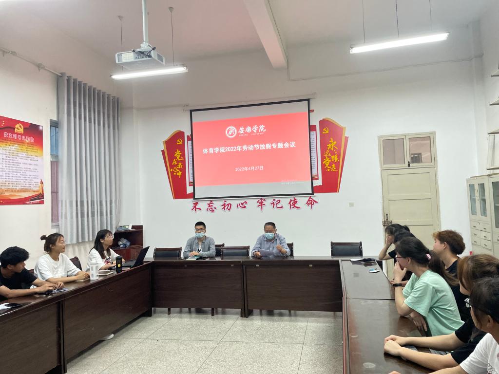 4月27日下午6点在体育馆1楼会议室召开2022年劳动节放假专题会。太阳成集团tyc234cc党总支书记高立平、学工办副主任王立、团总支书记康梦瑶、宿舍信息员参加了会议。会议由学工办副主任王立主持。