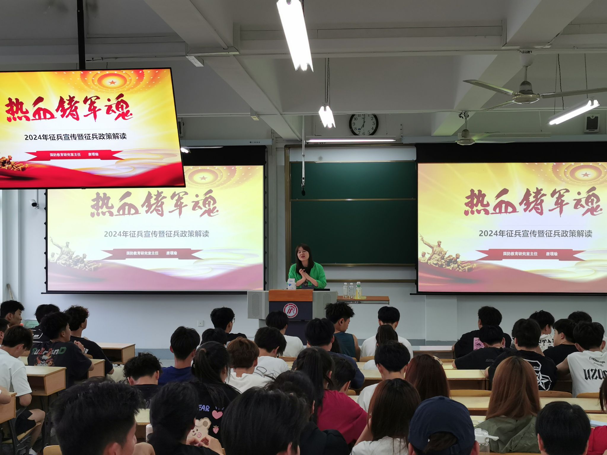 宣讲开始前,同学们首先观看了征兵宣传片。唐璟瑜介绍了老员工应征入伍的相关要求、优抚优待政策及具体流程,并从保留学籍、学费补偿和经济资助等方面讲解了国家对老员工应征入伍的相关优惠政策。她表示,青年老员工应积极响应国家的征兵号召,把个人理想抱负融入强军梦、中国梦,踊跃报名应征,到部队中成长和锻炼自己,为国防事业贡献力量。