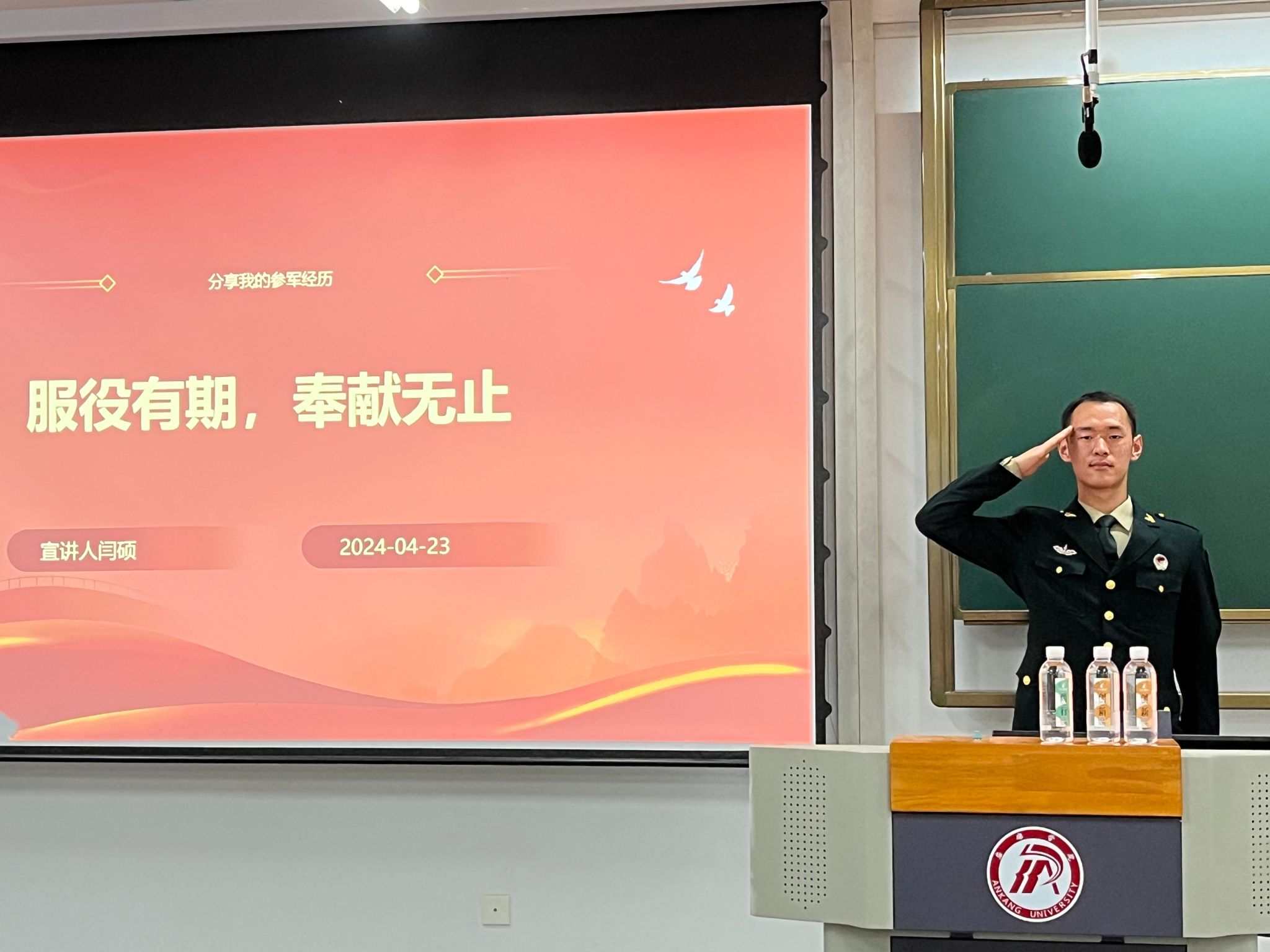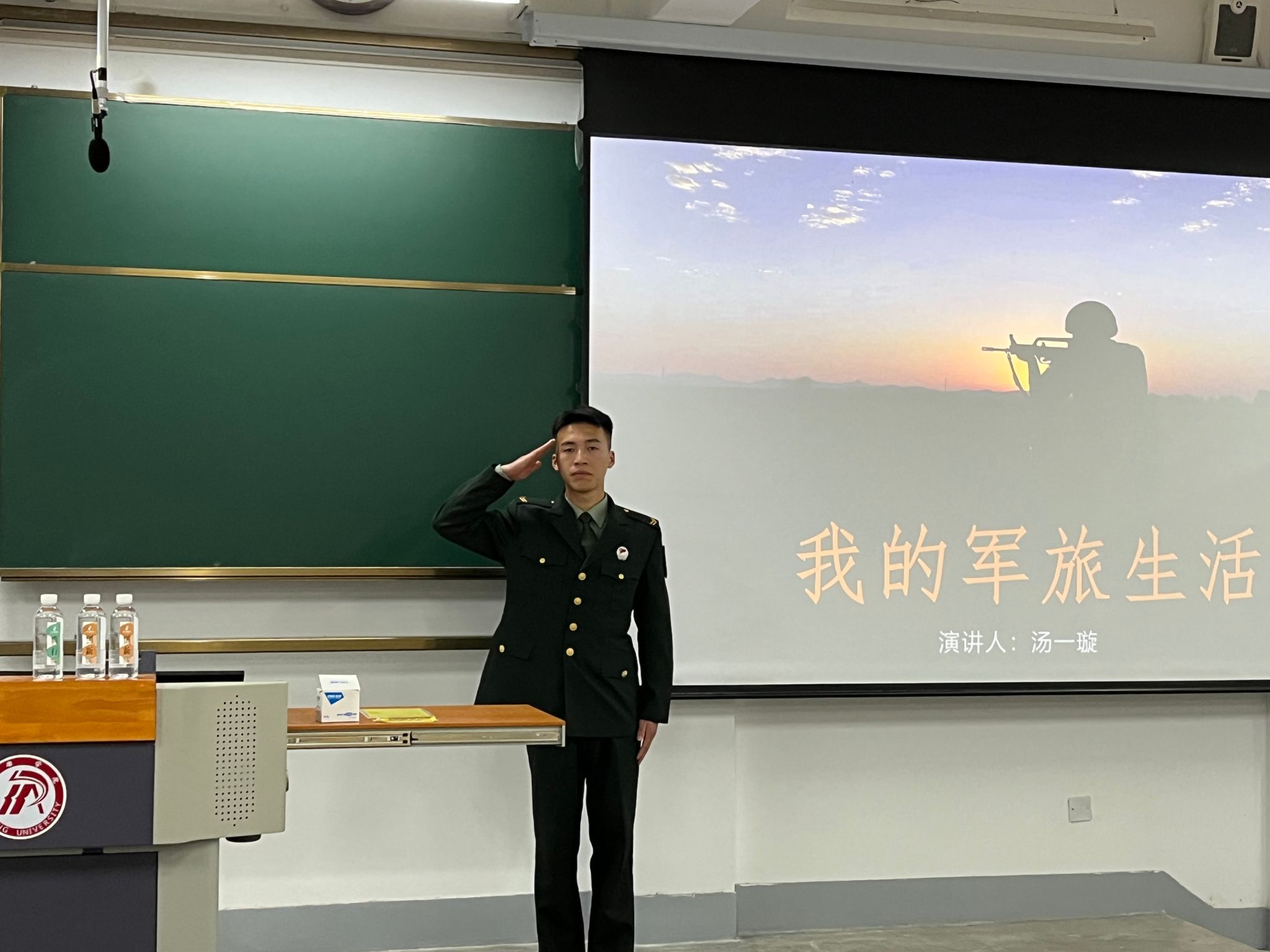 随后,我院特邀退伍军人2023级员工闫硕、汤一璇同学进行“服役有期,奉献无止”“我的军旅生活”事迹分享,他们从部队训练、执行任务、军营生活、军人待遇等方面做了详细介绍。他们勉励同学们,不要把生命献给无知、平庸和低俗,要把自己的前途和命运同国家和人民的需要结合起来,成为敢奋斗、敢担当的最可爱的人。