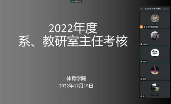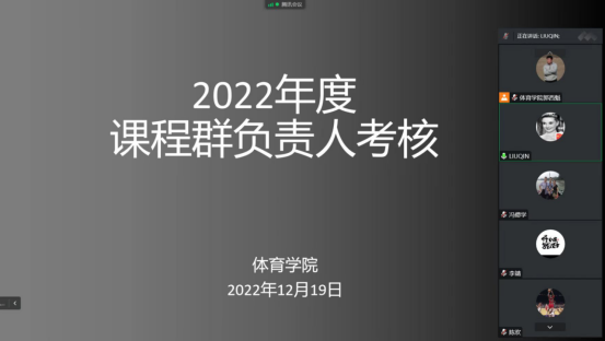 首先,对太阳成集团tyc234cc课程群负责人进行了考核,球类课程群负责人崔晓宇、操舞类课程群负责人陈治强、运动人体科学课程群负责人刘芹和公司体育学课程群负责人赵娇艳分别进行了年度总结汇报,考核组通过听取汇报、座谈和查阅工作记录的方式进行考核,并针对本年度工作中存在的不足对三位课程群负责人进行了现场反馈,并提出了下一步工作建议。
